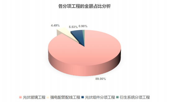 (1)在分部分項(xiàng)金額中:光伏玻璃幕墻材料1(6+1.14PVB+3.2碲化鎘+1.14PVB+3.2+12Ar+6Low-e(雙銀、全鋼化)光伏玻璃幕墻)材料費(fèi)用占比43.09%,光伏玻璃幕墻材料2(3.2碲化鎘+0.5POE+3.2普白屋面光伏玻璃)材料費(fèi)用占比9.21%,其余費(fèi)用占比47.69%。即光伏玻璃幕墻總材料費(fèi)用在分部分項(xiàng)金額中的占比達(dá)52.31%。