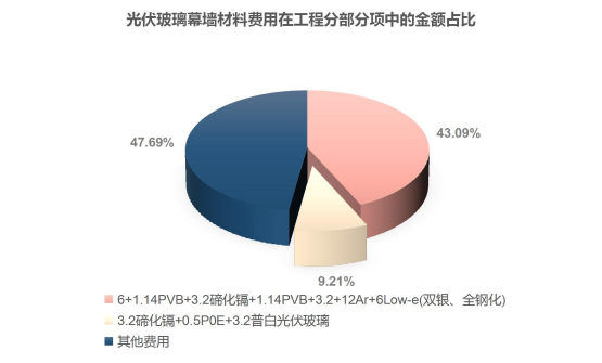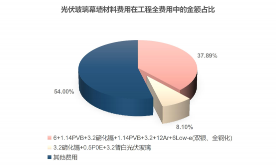 (2)在工程全費(fèi)用中:光伏玻璃幕墻材料1(6+1.14PVB+3.2碲化鎘+1.14PVB+3.2+12Ar+6Low-e(雙銀、全鋼化)光伏玻璃幕墻)材料費(fèi)用占比37.89%,光伏玻璃幕墻材料2(3.2碲化鎘+0.5POE+3.2普白屋面光伏玻璃)材料費(fèi)用占比8.10%,其余費(fèi)用占比54.00%。即光伏玻璃幕墻總材料費(fèi)用在工程總費(fèi)用中的占比達(dá)45.99%。