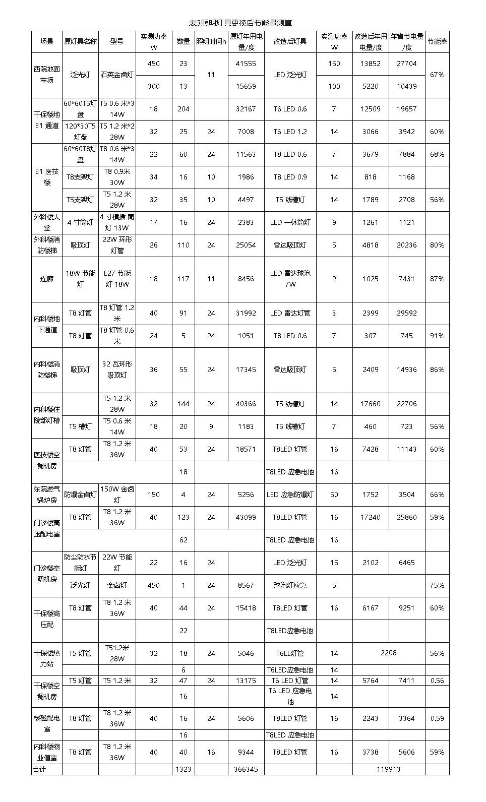 表3數(shù)據(jù)表明醫(yī)院更換LED燈具后顯著降低了能耗和運營成本。根據(jù)數(shù)據(jù)測算,改造后的LED燈具在多個場景中實現(xiàn)了56%至91%的節(jié)能率。以西院地面車場泛光燈為例,功率從450W降至150W,年節(jié)電量達27704度。按照每度電0.7元計算,醫(yī)院每年可節(jié)省電費約2,129,246元。另外,LED燈具的長壽命和低維護成本進一步降低了總體擁有成本。這些數(shù)據(jù)強有力地證明了高效節(jié)能照明系統(tǒng)在建筑安裝工程中的經(jīng)濟合理性,以及其在節(jié)能減排方面的長遠利益。